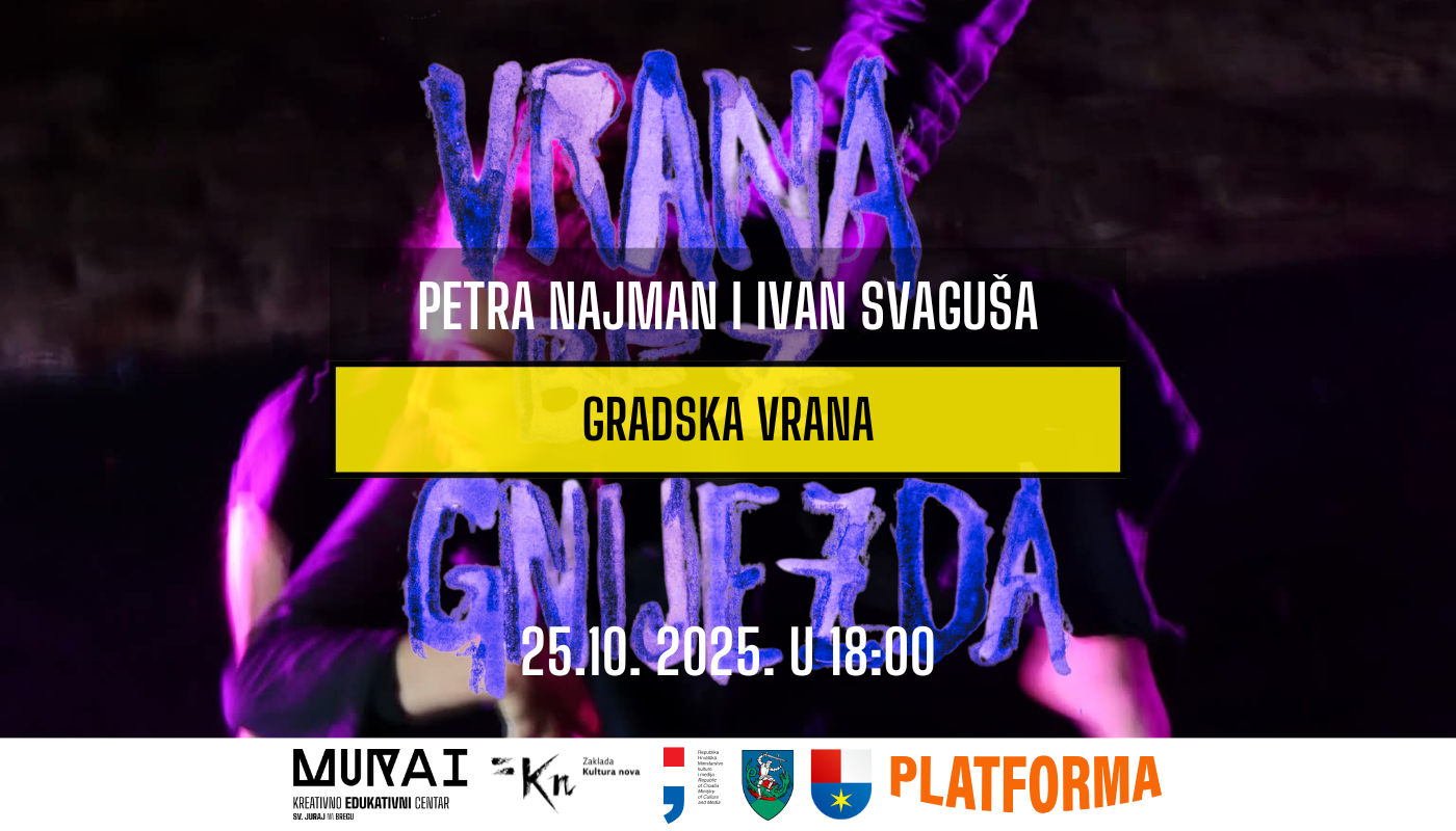 U subotu, 25. listopada 2025. godine u 18:00 sati, u KEC-u Murai u Pleškovcu održat će se izvedba Gradska Vrana, autorskog dua Petre Najman i Ivana Svaguše – izvedbeno-zvučni fragment interdisciplinarnog projekta „Vrana bez gnijezda“. Publiku očekuje poetski, fizički i glazbeni susret s bićem koje stoji između svijeta ljudi i svijeta slobode, između tame i svjetla, između onoga što jesmo i onoga što nam društvo dopušta da budemo.